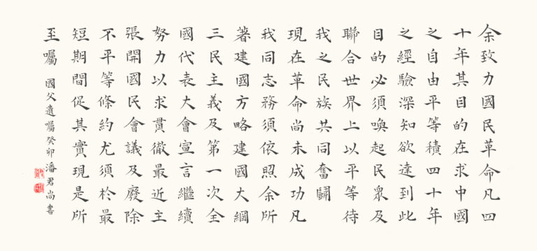 For 40 years I have devoted myself to the cause of the people’s revolution with the aim of securing for China a position of freedom and equality. My experiences during these 40 years have convinced me that to attain this goal we must bring about an awakening of our own people, ally with those peoples of the world who treat us as equals, and struggle together. At the moment, the Revolution has not yet succeeded. Let all comrades continue to strive towards its fruition by following my Plans for National Reconstruction (《建國方略》), Fundamentals of National Reconstruction (《建國大綱》), Three Principles of the People (《三民主義》), and the Declaration of the First National Congress of the Kuomintang (《第一次全國代表大會宣言》). The convocation of a National Congress and the abrogation of the unequal treaties that I have advocated recently must be fulfilled first and foremost. This is my heartfelt charge to you.